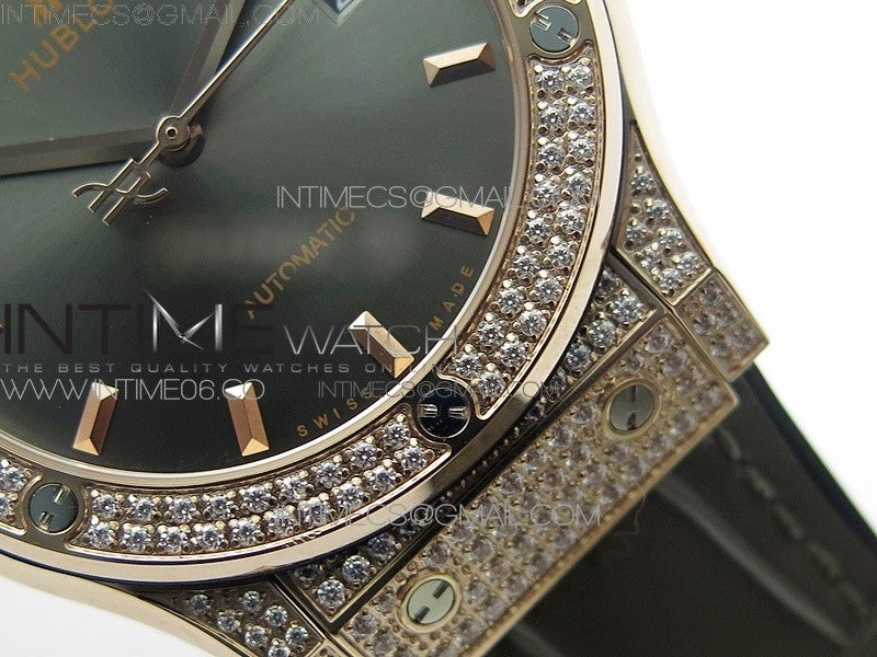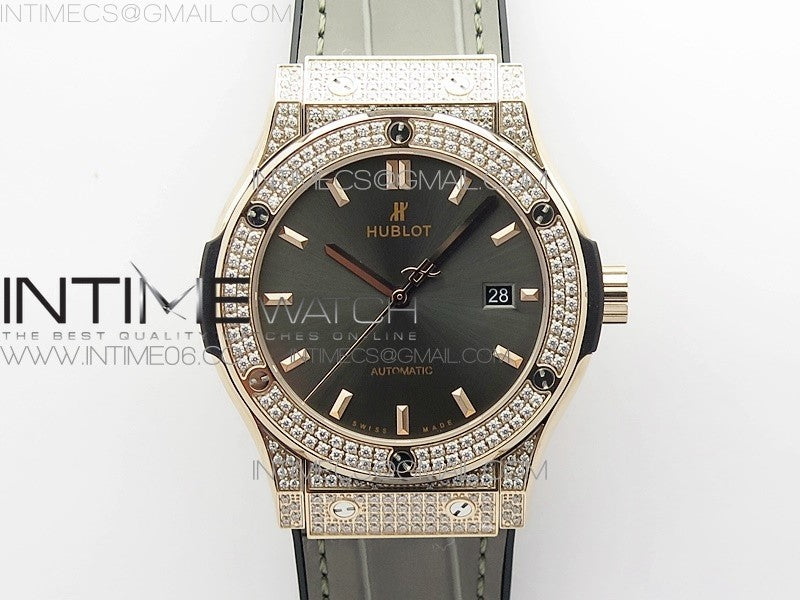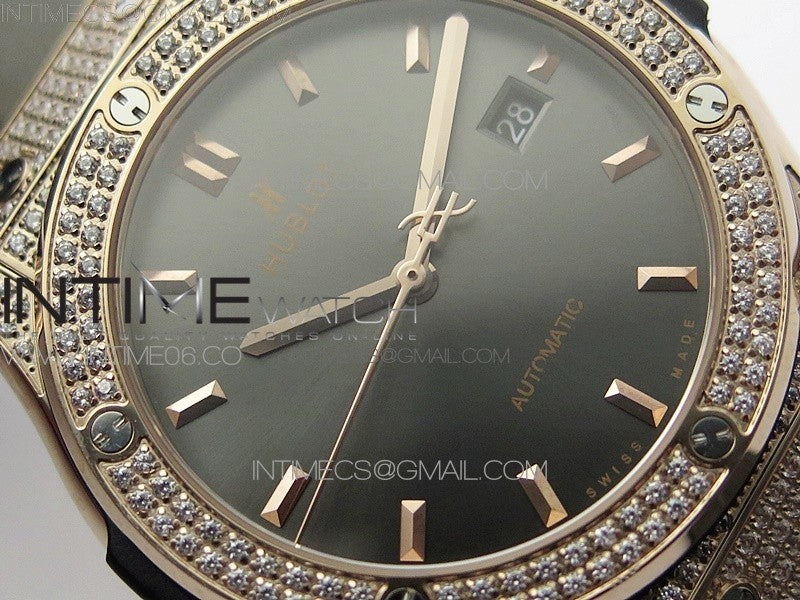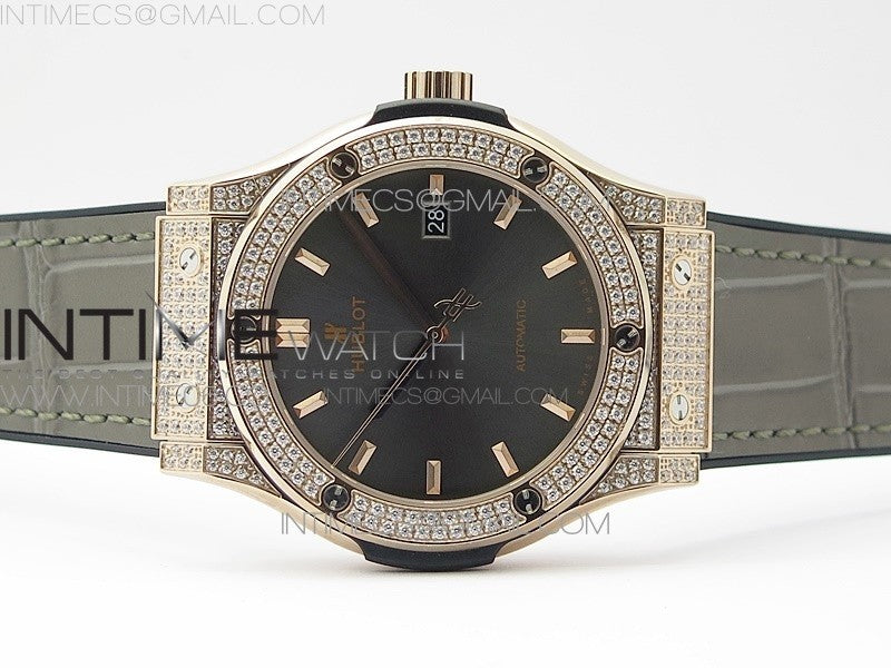 Classic Fusion 42mm RG Paved Diamonds Case/Bezel B50F Gray Dial On Gray Gummy Strap A2892