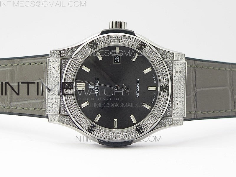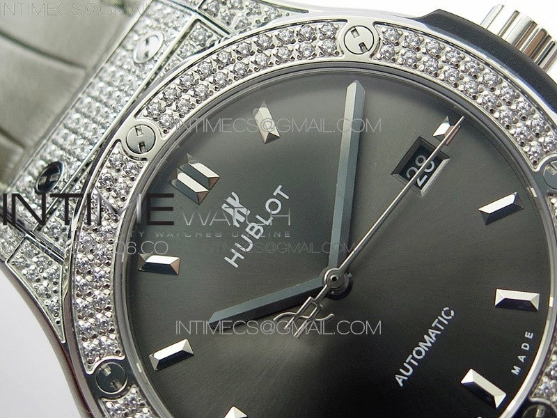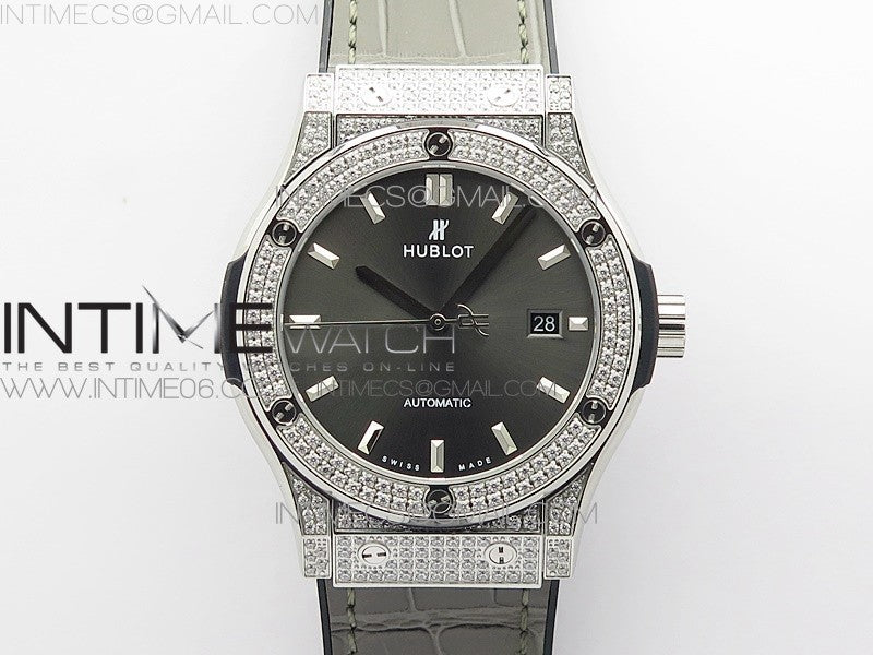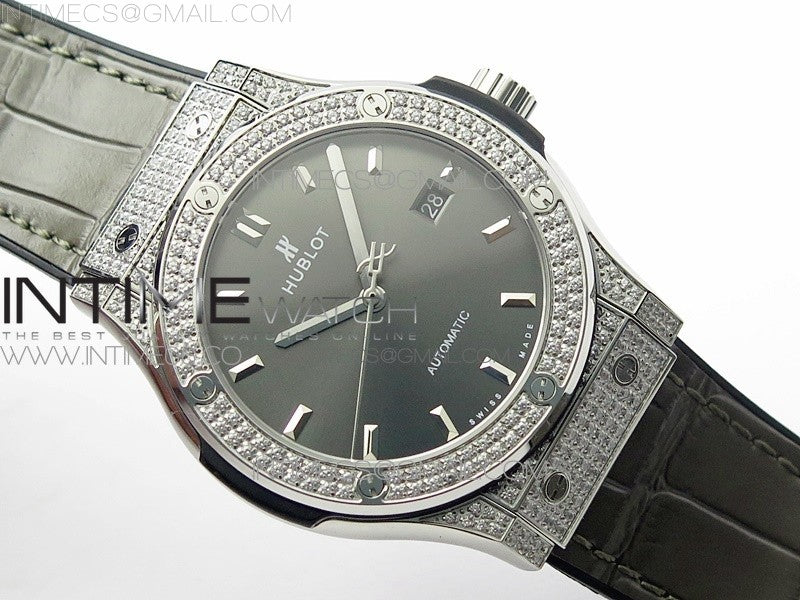 Classic Fusion 42mm SS Paved Diamonds Case/Bezel B50F Gray Dial On Gray Gummy Strap A2892